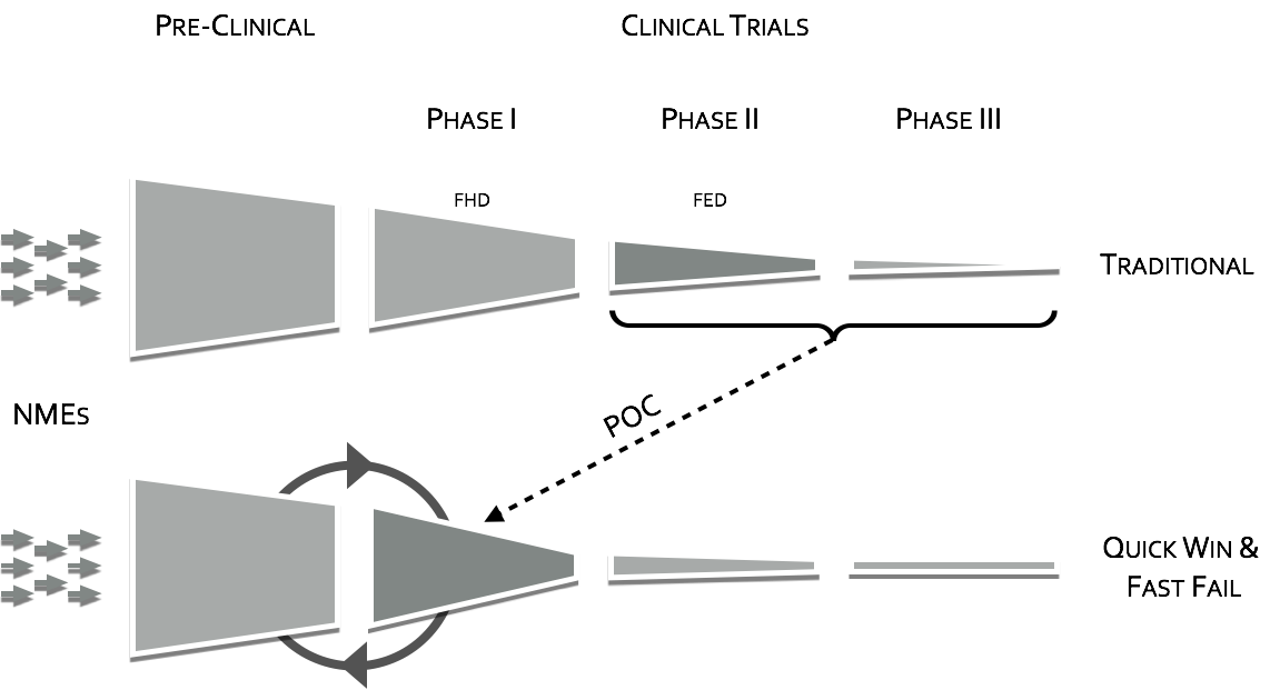 To quote the former director of National Institutes of Mental Health (NIMH), Dr. Thomas InselIII, “Given that over 95% of compounds fail during the clinical phases of development (a fact not appreciated by looking at the published literature which is biased towards positive results), success may require rapid failures in order to conserve resources by moving quickly to the next candidate (“fast-fail”IV)." The “fast-fail, quick win” model (see figure below) is one where the proof of concept (POC) is shifted earlier in the clinical trials, from phases II & III to phase I, from on or after the first effective dose (FED) to the first human dose (FHD) or shortly thereafter.
